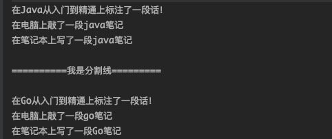 System.out.println("在Go从入门到精通上标注了一段话!");