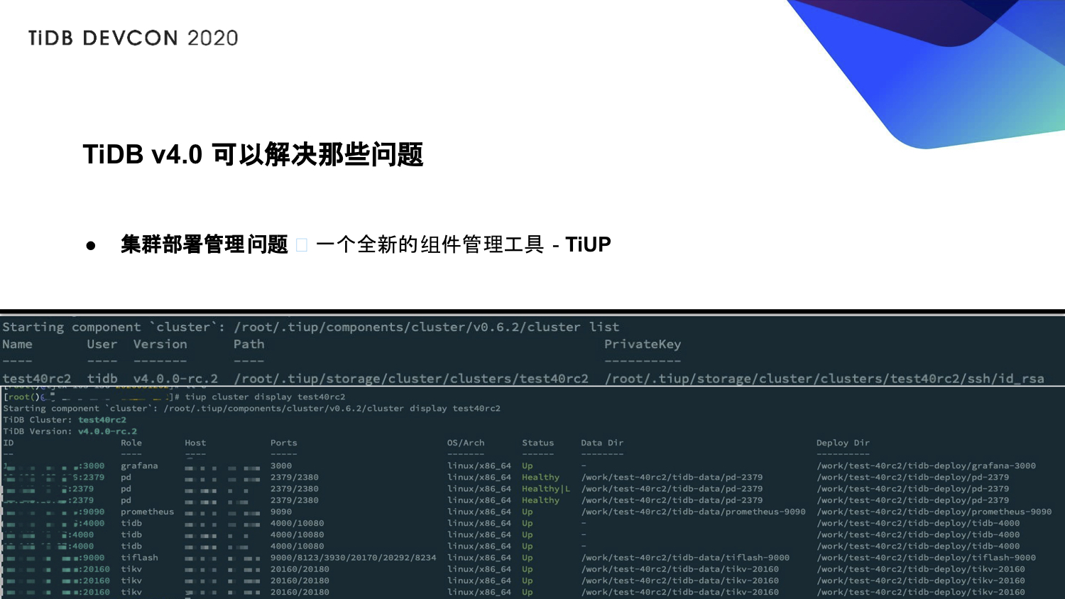 之前在使用 TiDB Ansible 管理的时候,其实是比较困难的,并且 TiDB Ansible 自身也存在一些问题。TiDB 4.0 开发了一个全新的组件管理工具——TiUP,这个工具目前在体验上是非常好的,我们在一分钟内就可以部署完成 3 个 TiDB,3 个 PD, 3 个 TiKV 和 1 个 TiFlash,这个效果是非常惊艳的,而且 TiUP 也有大量的参数可以查看我们集群的状态。我们要特别提醒一点,TiFlash 的端口管理非常复杂,有特别多的端口,大家在使用的时候一定要做好 TiFlash 端口管理。