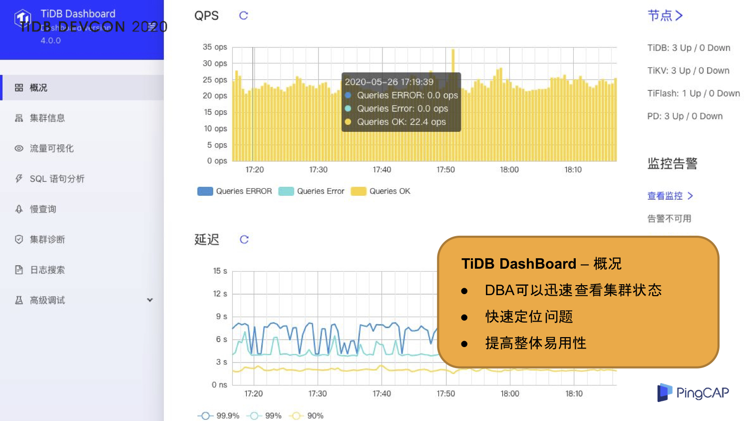 TiDB DashBoard 是 TiDB 4.0 特别有亮点的一个功能,它可以实时的获取到我们集群的信息。上图是 DashBoard 概况页面,里面包含了 QPS、响应延迟、节点的状态,以及告警相关的一些内容。通过概况, DBA 可以迅速的查到集群的状态,快速定位问题,提高了应用性,可以说 TiDB 4.0 整体的应用性已经非常高了。