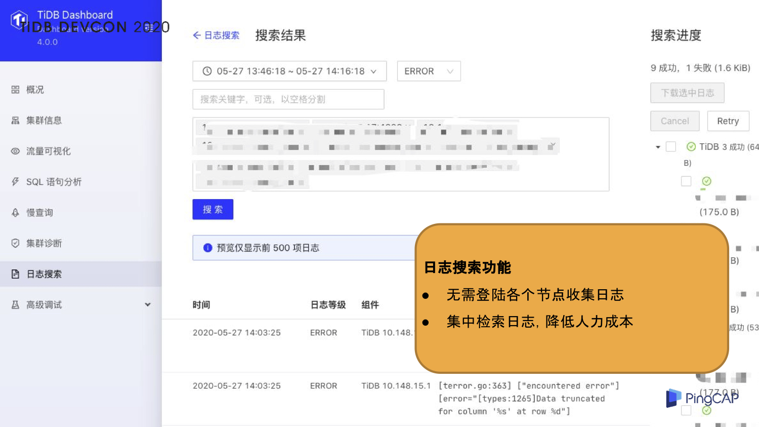慢查询可以说是里程碑的一个功能。之前一直在吐槽 TiDB 慢查询的问题,我们从 1.0 吐槽到 4.0,但是 4.0 有了 DashBoard 后,可以指定数据库,查看不同的慢查询,也可以快速的定位我们的慢查询。我们不再需要自己 ETL,也不需要自己再上机器,就可以快速的定位到慢查询,而且包含排序、执行时间等信息,这是对于即将要使用 TiDB 的公司来讲,一个非常利好的消息。