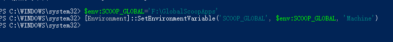 $env:SCOOP_GLOBAL='F:\\GlobalScoopApps'