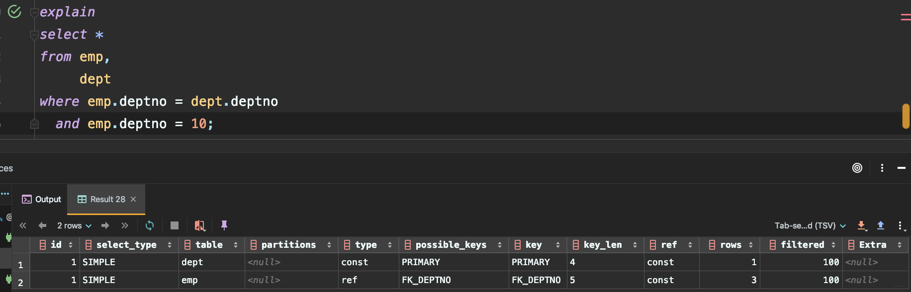 当将PRIMARY KEY或UNIQUE索引的所有部分与常量值进行比较时,将使用const。在以下查询中,tbl_name可以用作const表: