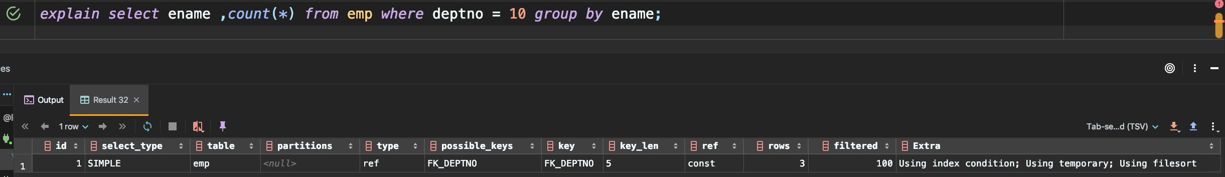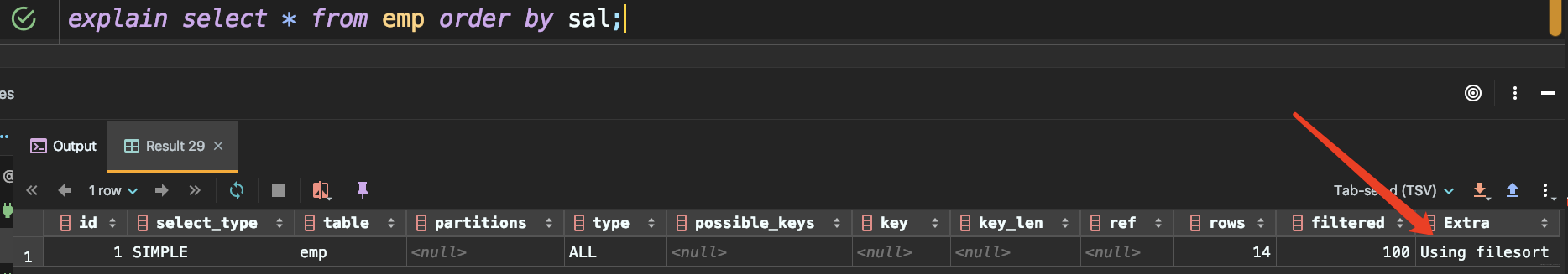 如果EXPLAIN输出的Extra列不包含Using filesort,则使用索引,并且不执行文件排序