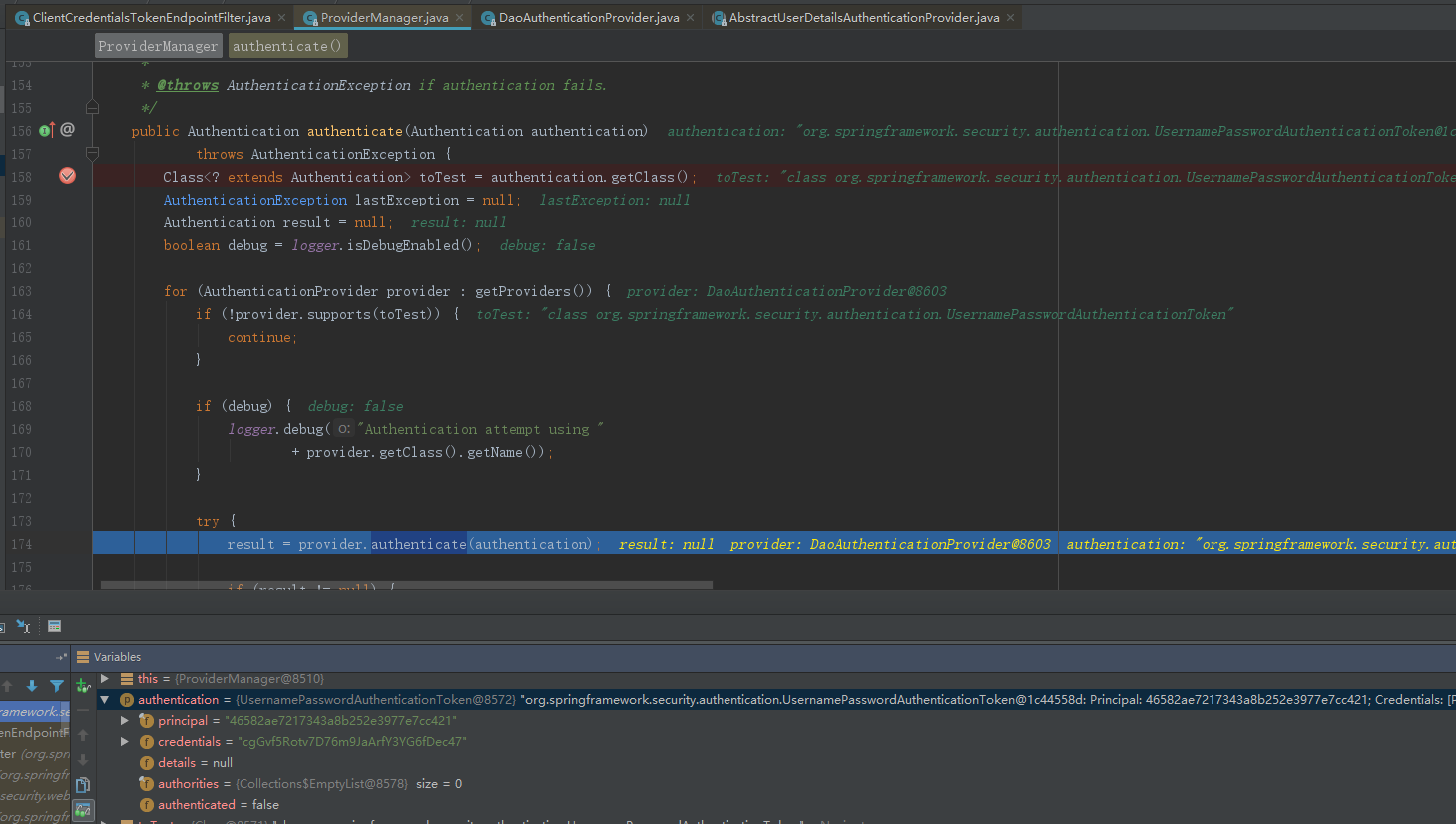 获取clientId,clientSecret组装成一个UsernamePasswordAuthenticationToken作为身份标识,经过容器中的认证管理器 AuthenticationManager 进行身份认证。AuthenticationManager 核心实现由ProviderManager完成。