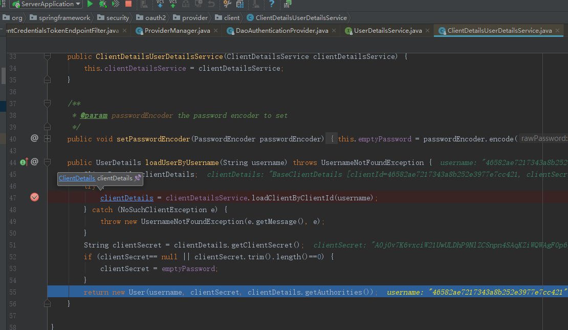 这边调用UserDetailsService的一个实现类ClientDetailsUserDetailsService 查询 ClientDetails 信息,这个设计是将client客户端的信息(client_id,client_secret)适配成用户的信息(username,password)。
