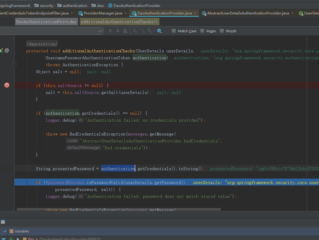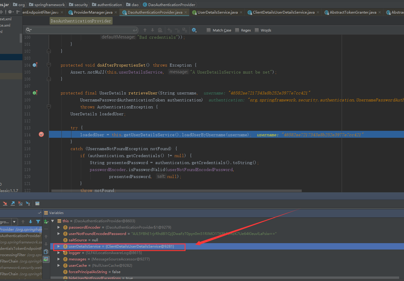 之后,再次进如DaoAuthenticationProvider 认证clientId和clientSecret