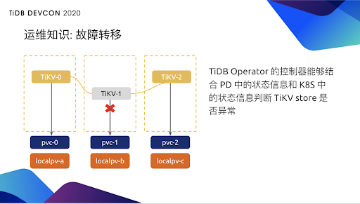 比如,现在 TiKV1 运行的不正常,那么 Operator 的控制器就可以结合 PD 里的 TiKV1 对应的 store 状态信息和 K8s 里它所在容器的状态信息,来判断这一个 TiKV 的 store 是否异常。判断逻辑大致是 store 处于异常状态,并且持续超过一定时间。检测到异常后隔多久再做故障恢复以及怎么样判断是否发生异常,本身也是一种运维知识。