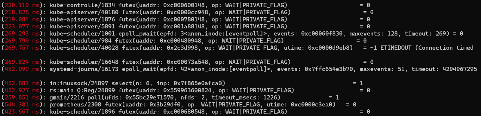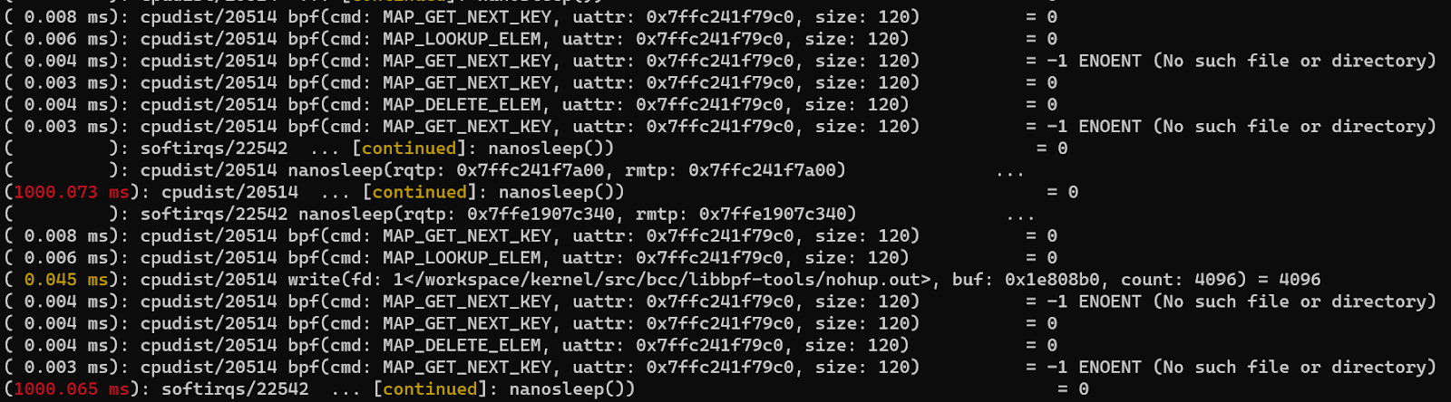 perf trace --duration 200从输出中可以看到进程名称、pid ,超过 200 ms 的具体系统调用参数和返回值。