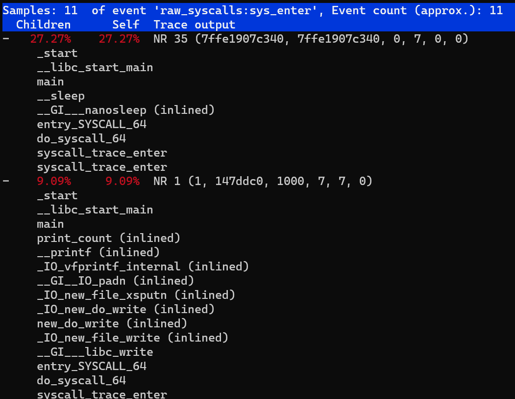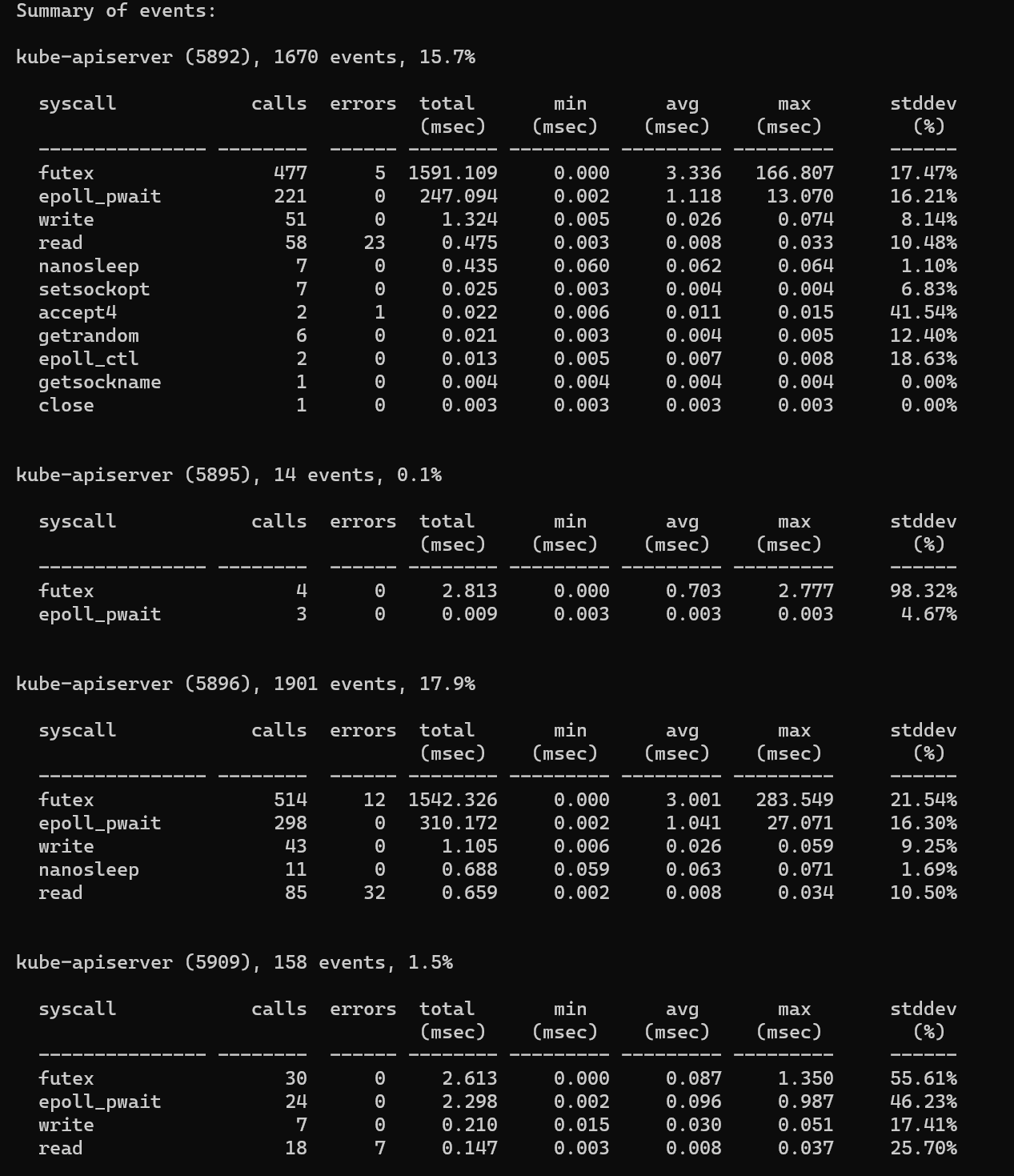 perf trace -p $PID -s从输出中可以看到各系统调用的次数,返回错误次数,总延迟,平均延迟等信息。