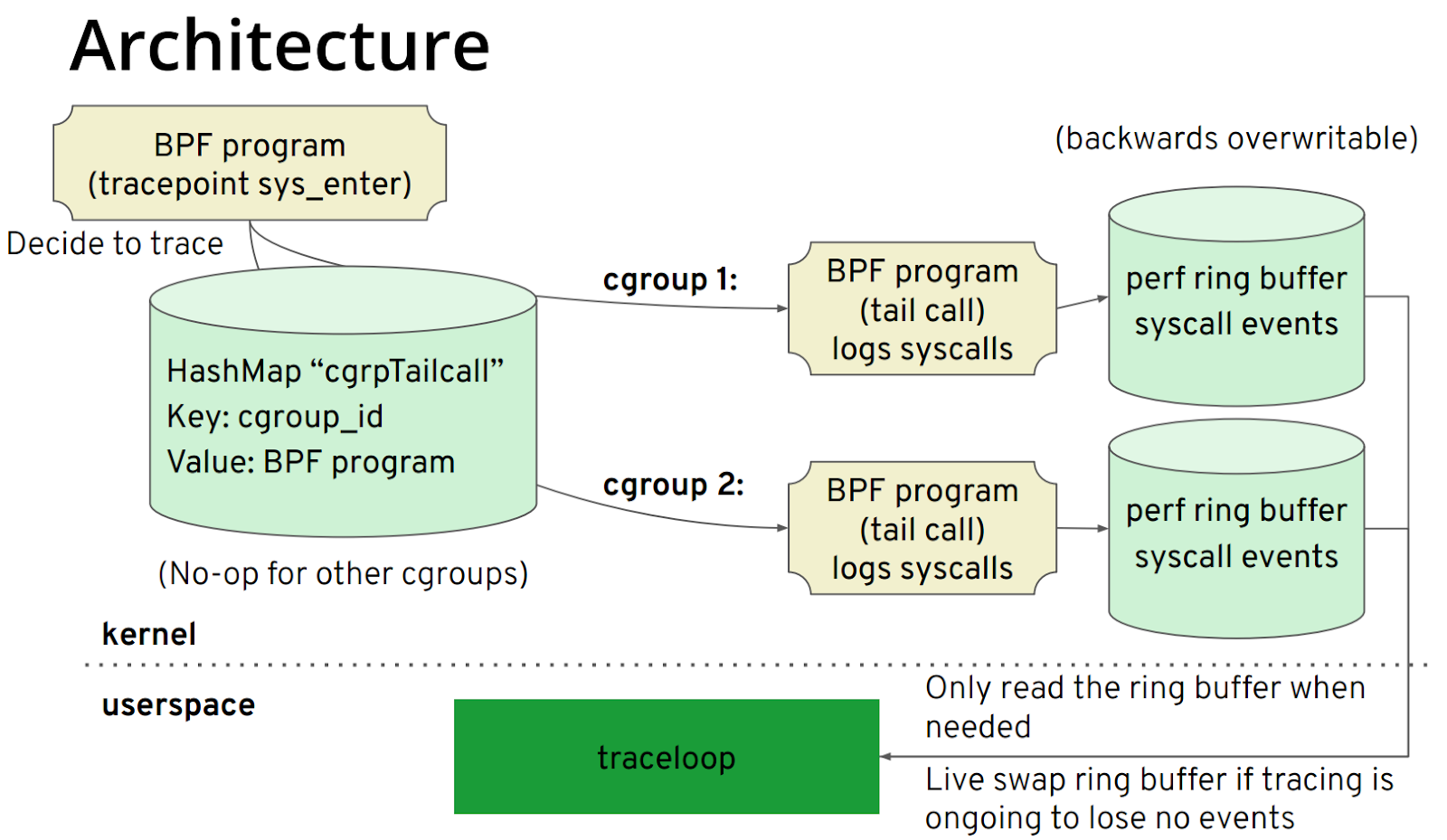 对于 Traceloop 大家可能有点陌生,但提到 BCC 想必大家就觉得熟悉了。BCC 的前端是 Python/C++,其所属 iovisor 下还有一个项目叫 gobpf 是 BCC 的 go binding。而 Traceloop 则是基于 gobpf 库进行开发的,此项目的主要目标应用场景是容器、K8S 环境。其原理比较简单,其架构如图所示: