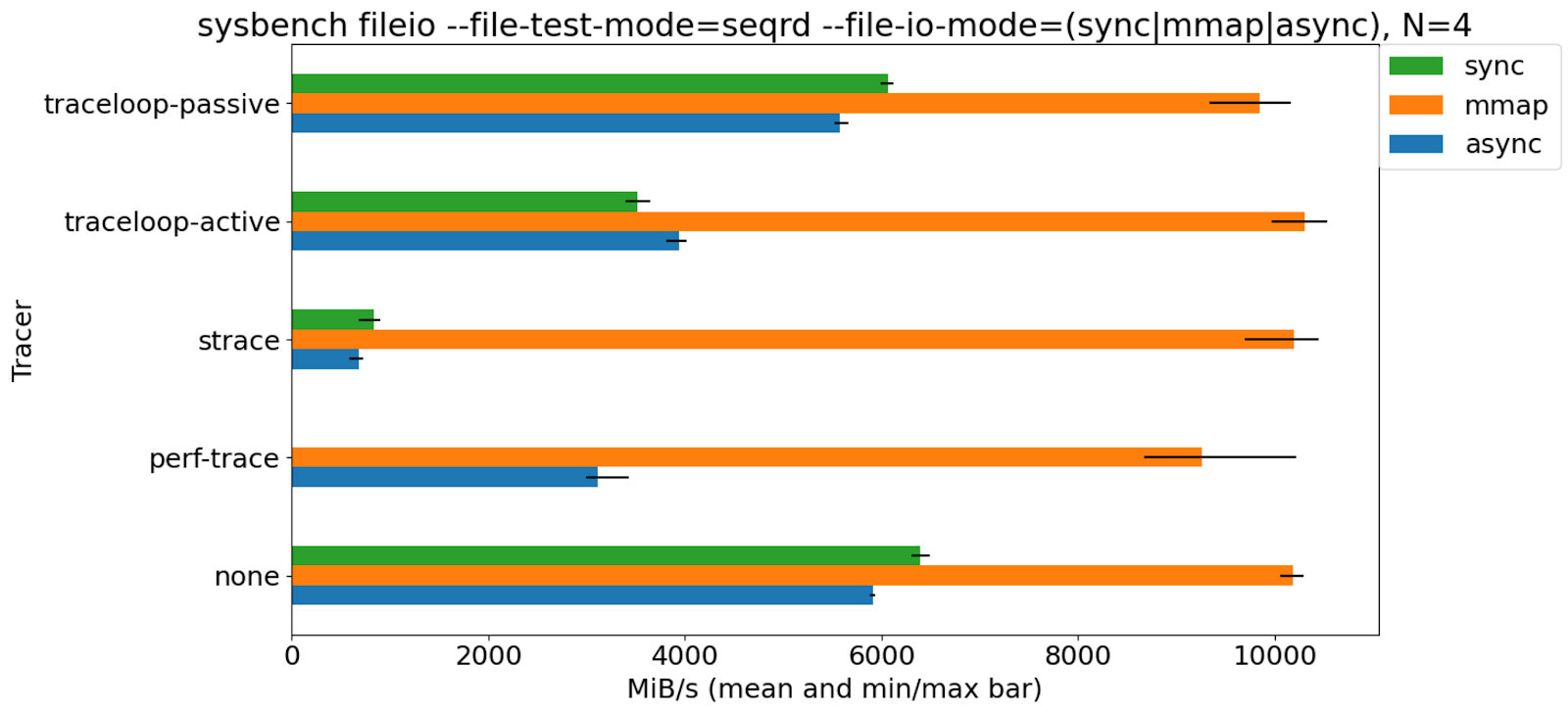 从 benchmark 结果看,strace 的引起的目标程序性能下降最大,perf trace 次之,traceloop 最小。