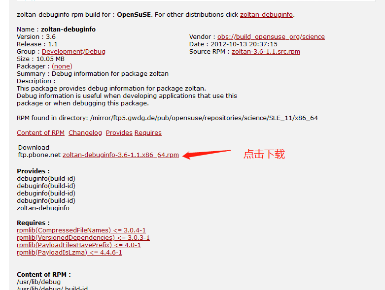 点击第一个结果进入详情界面,可以看到rpm包的具体信息,包括依赖以及包里内容