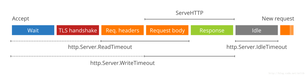 log.Println(srv.ListenAndServeTLS("", ""))ReadTimeout是从连接accept一直到所有请求的body被完全读取(如果不读body,那就是所有header被读取)。该超时是net/http包在连接accept之后直接设置SetReadDeadline的。