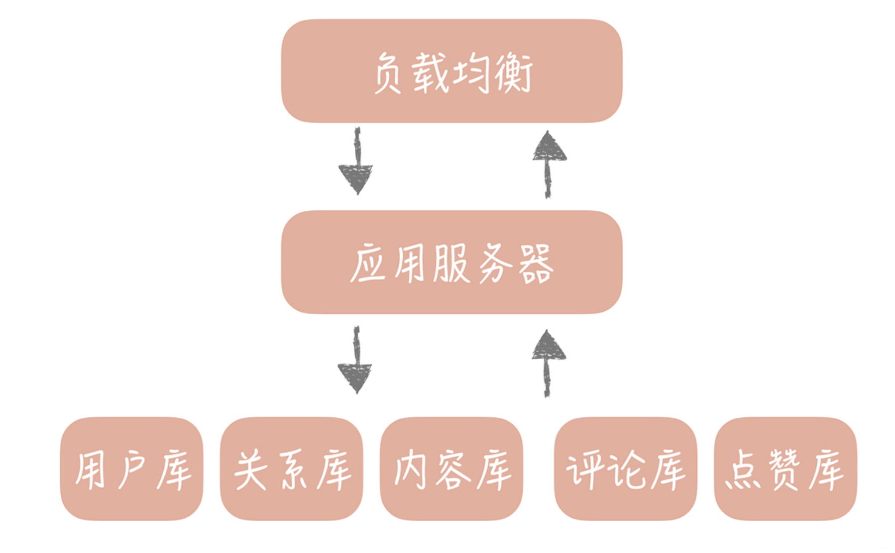 拆分后,这简单社区系统就有用户库、内容库、评论库、点赞库和关系库。这还能隔离故障,某库挂了不会影响到其它DB。