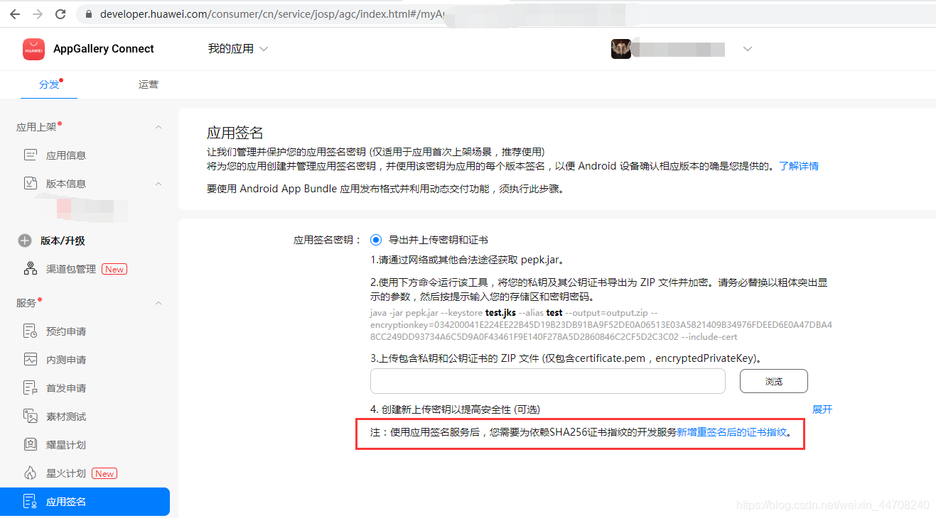 新应用使用应用签名服务:https://developer.huawei.com/consumer/cn/doc/development/AppGallery-connect-Guides/agc-appsigning-newapp