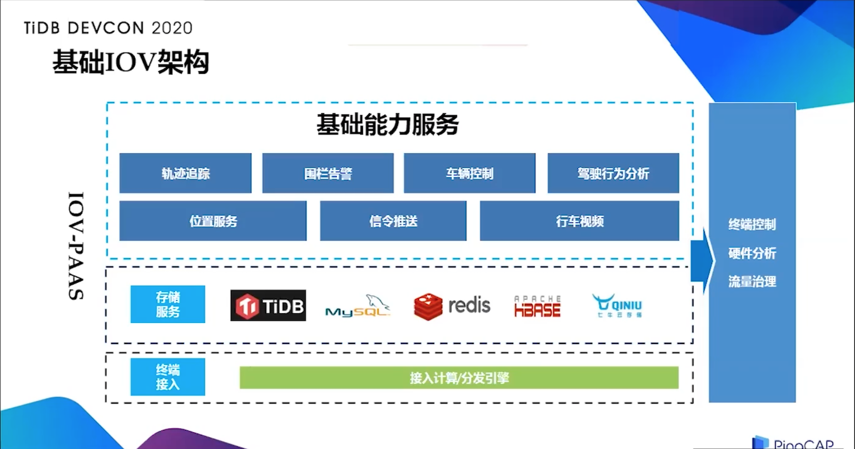 首先讲一下基础架构,车载设备中搭载在小汽车上的 opd 设备会根据业务类型的配置,及时发送报文到切入计算模块和分发引擎,将报文按照预先制定的协议解析,把不同的信息分发到下游不同的服务。比如,轨迹服务、告警服务。不同服务的存储媒介是不一样的,比如说轨迹放到 TiDB,位置服务放在 Redis 集群,行车视频是放在七牛的对象存储,完整的报文信息是放在 HBase 做数据分析。