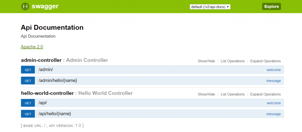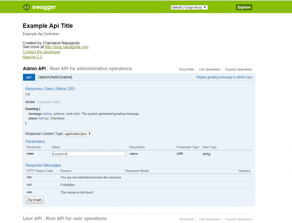 package com.chandana.helloworld.controllers;import com.chandana.helloworld.bean.Greeting;import io.swagger.annotations.Api;import io.swagger.annotations.ApiOperation;import io.swagger.annotations.ApiResponse;import io.swagger.annotations.ApiResponses;import org.springframework.web.bind.annotation.PathVariable;import org.springframework.web.bind.annotation.RequestMapping;import org.springframework.web.bind.annotation.RequestMethod;import org.springframework.web.bind.annotation.RestController;@RestController@RequestMapping("/api")@Api(value = "user", description = "Rest API for user operations", tags = "User API")public class HelloWorldController { @RequestMapping(value = "/hello/{name}", method = RequestMethod.GET, produces = "application/json") @ApiOperation(value = "Display greeting message to non-admin user", response = Greeting.class) @ApiResponses(value = { @ApiResponse(code = 200, message = "OK"), @ApiResponse(code = 404, message = "The resource not found")