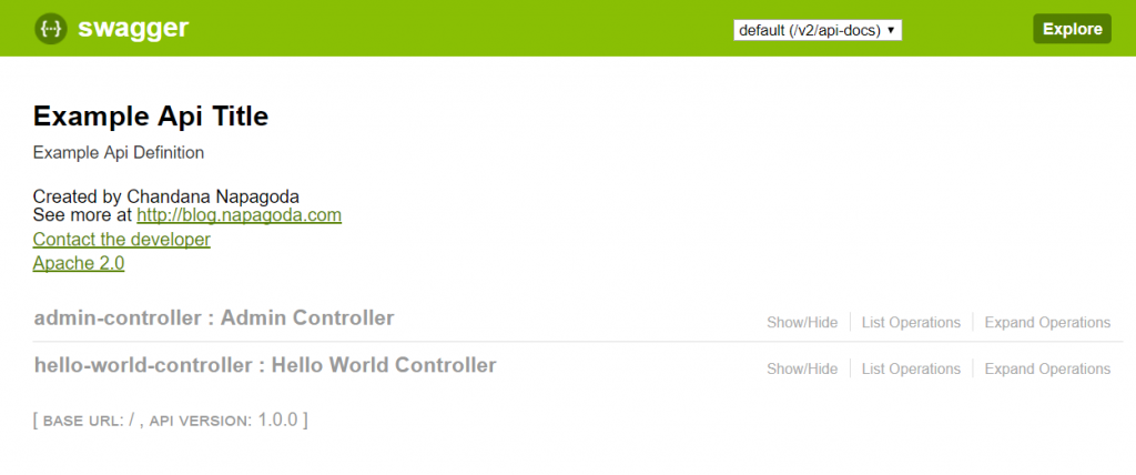 package com.chandana.helloworld.config;import org.springframework.context.annotation.Bean;import org.springframework.context.annotation.Configuration;import springfox.documentation.builders.ApiInfoBuilder;import springfox.documentation.builders.PathSelectors;import springfox.documentation.builders.RequestHandlerSelectors;import springfox.documentation.service.ApiInfo;import springfox.documentation.service.Contact;import springfox.documentation.spi.DocumentationType;import springfox.documentation.spring.web.plugins.Docket;import springfox.documentation.swagger2.annotations.EnableSwagger2;
