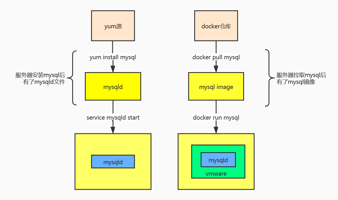右边的MySQL启动后,自带一套环境变量,和服务器环境互不影响,像把一个新生儿放进了保温箱,保温箱有自己的温度湿度氧气,保温箱再放进病房里。