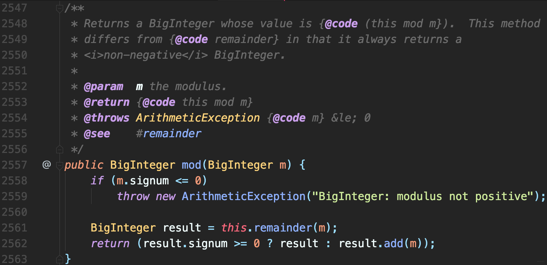 文档注释并没说「若 m 为空,mod 将抛NPE」,尽管方法确实这么做了,作为调用m.signum()的副产物。该异常记录在外围 BigInterger 类级别的文档注释。类级别注释适用于类的所有public方法中的所有参数。这可以避免在每个方法上分别记录每个 NullPointerException 而造成混乱。