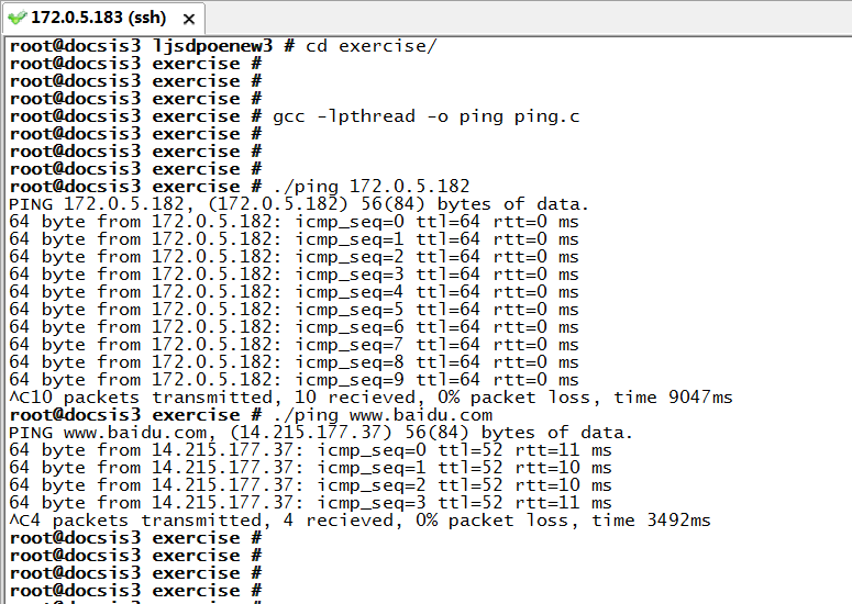 我的实验环境是两台服务器,发起ping的主机是172.0.5.183,被ping的主机是172.0.5.182,以下是我的两次实验现象(ping IP和ping 域名)。