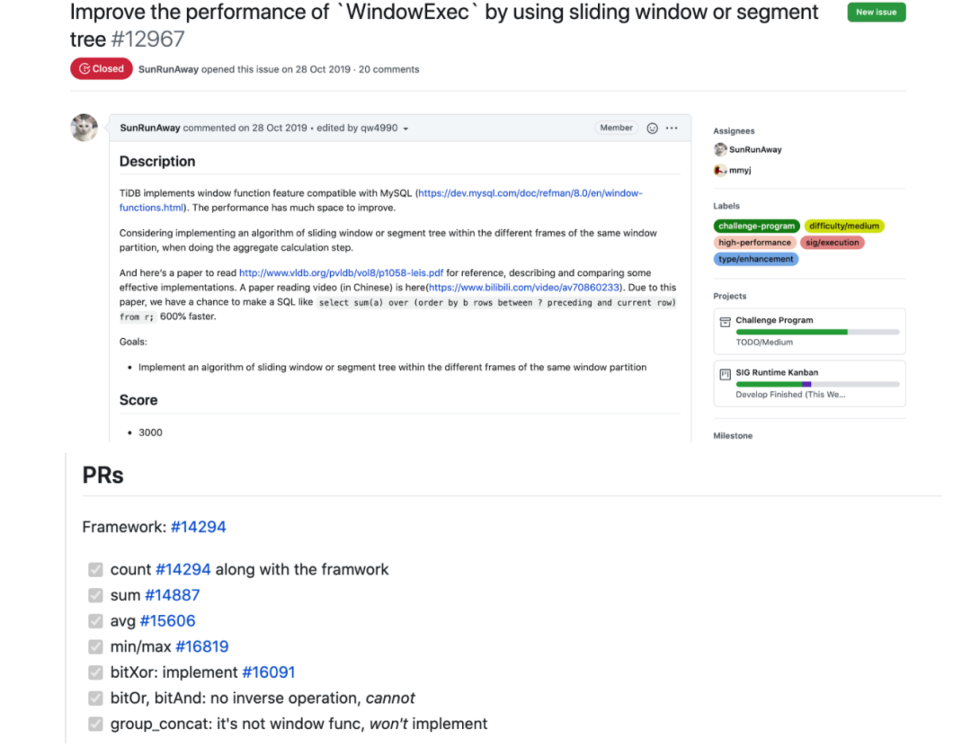 有一个 PR 我断断续续做了很久,优化灵感的来源是一篇论文,我先花一个月时间看完了论文,然后再花一个月时间看 TiDB 代码,研究怎么修改才能达到论文的效果。难点在于,这个 PR 有很多优化的小点,把所有优化点都做完,整个战线就需要拉的很长。