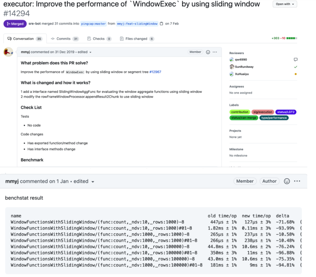 上面提到解决的最难的一个 PR 对执行器优化巨大,引入了滑动窗口的优化,提升了某些常用窗口函数的 10 倍计算效率。