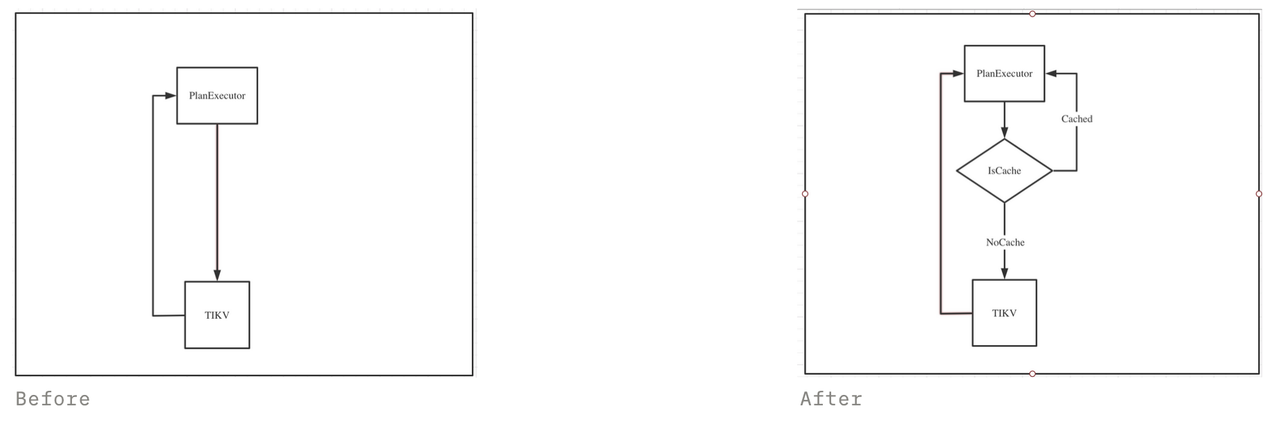 上图简化了很多流程,最直接的就是在 executor 和 tikv 中增加了一层 cache,这个做法的直接效益是将数据从TIKV层返回移到TIDB层返回,减少一层网络开销。同时,数据从 cache 里面返回比从磁盘返回的速度更快。