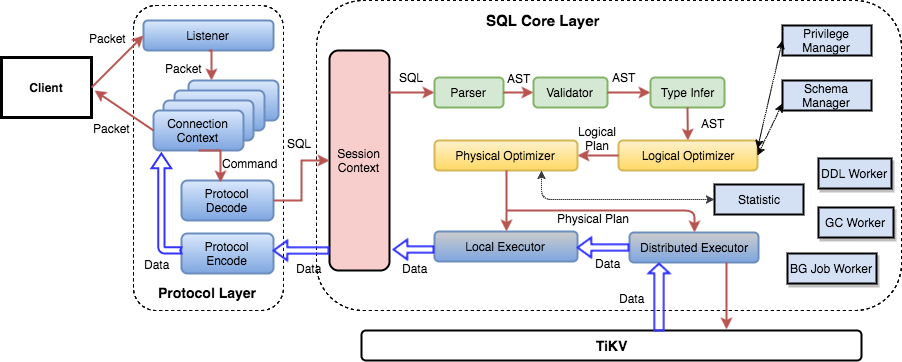本文先把 TiDB 官方的流程图贴在下方,这样更好的能让大家对整体的 SQL 流程有个感知。图中客户端发起请求,TiDB 的服务端接收到对应的数据包,服务端 Parse、Valid 等步骤生成 AST,接着通过逻辑优化和物理优化生产对应的执行计划,接着通过对应的执行算子去执行对应的 Plan,接着通过 RPC 去访问 TiKV 获取对应的数据。