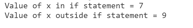 function foo() { var x = 9; if (x > 5) { let x = 7; console.log("Value of x in if statement = " + x);