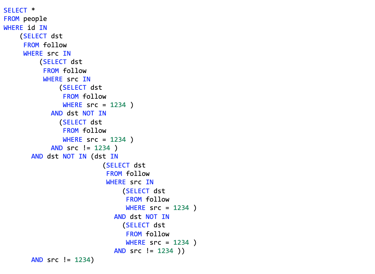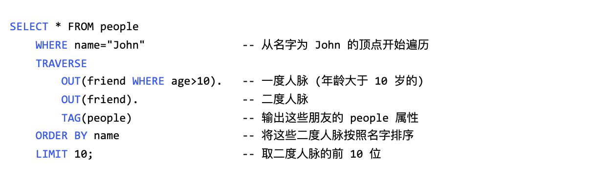 首先,要设计一套与 SQL 极具兼容性、优雅且高扩展的语法,以下是目前两个非常流行的图查询语法两度人脉的示例: