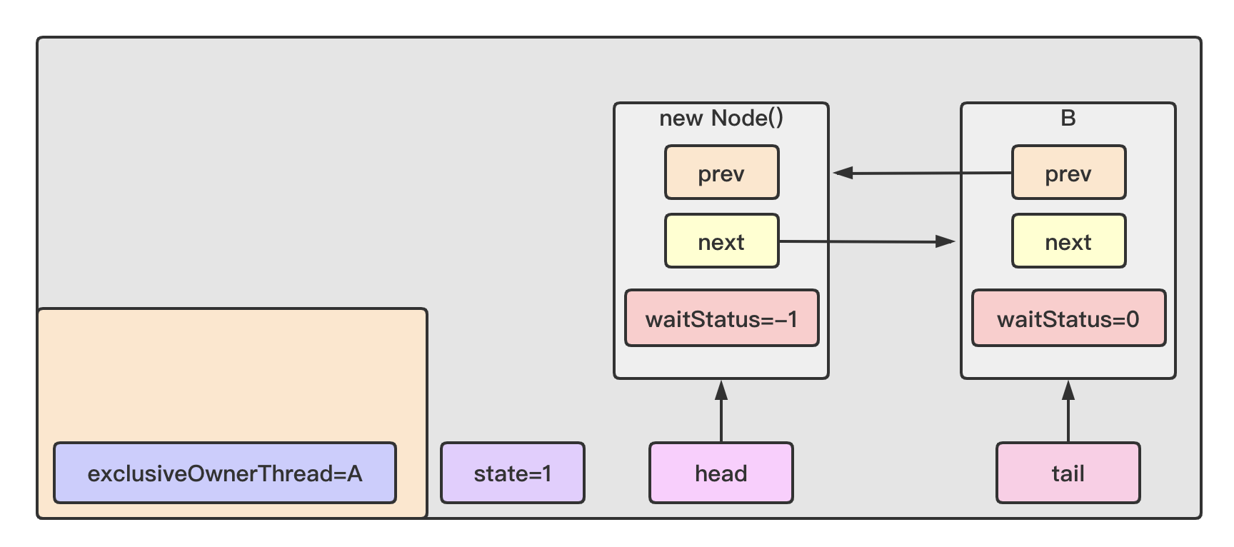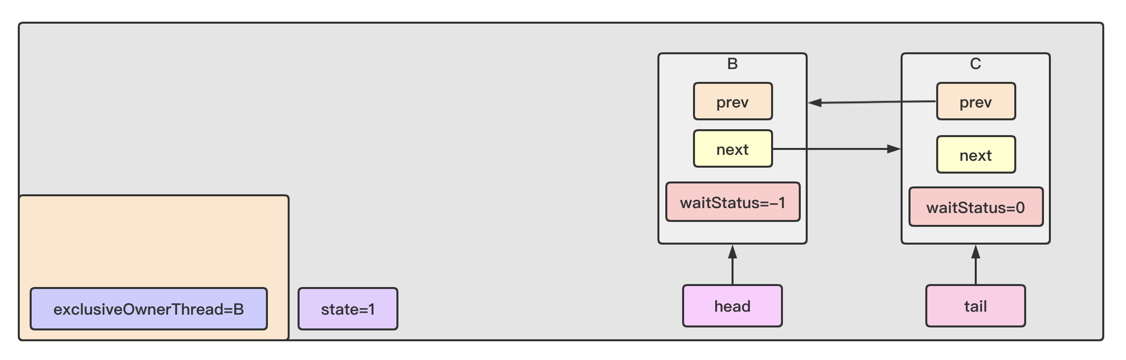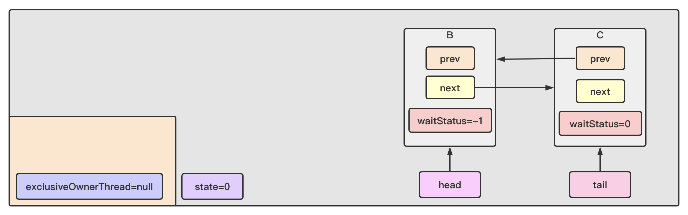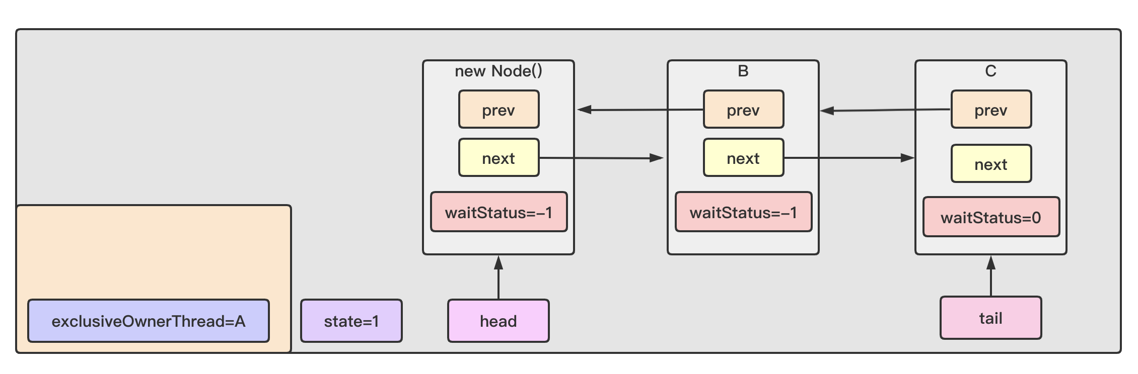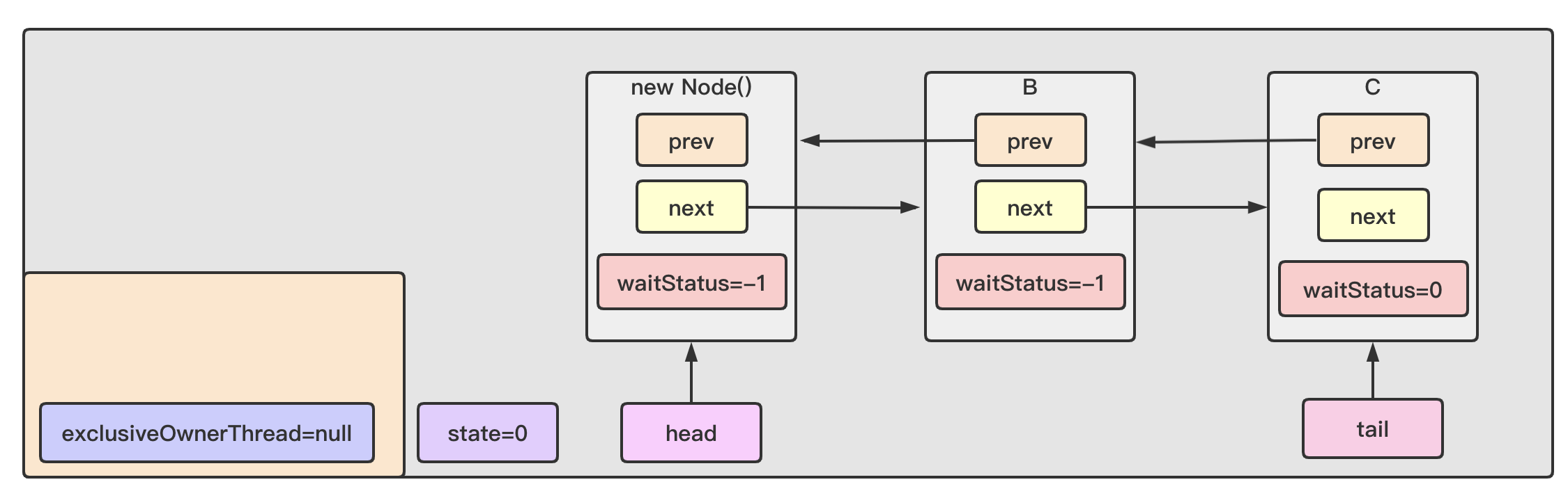 假设,此时线程A依然没有unlock,此时线程C也要来获取锁。显然线程C会竞争失败,AQS会将其封装为Node节点入队,并将线程B的Node节点的waitStatus改为SIGNAL(-1),然后Park休眠。