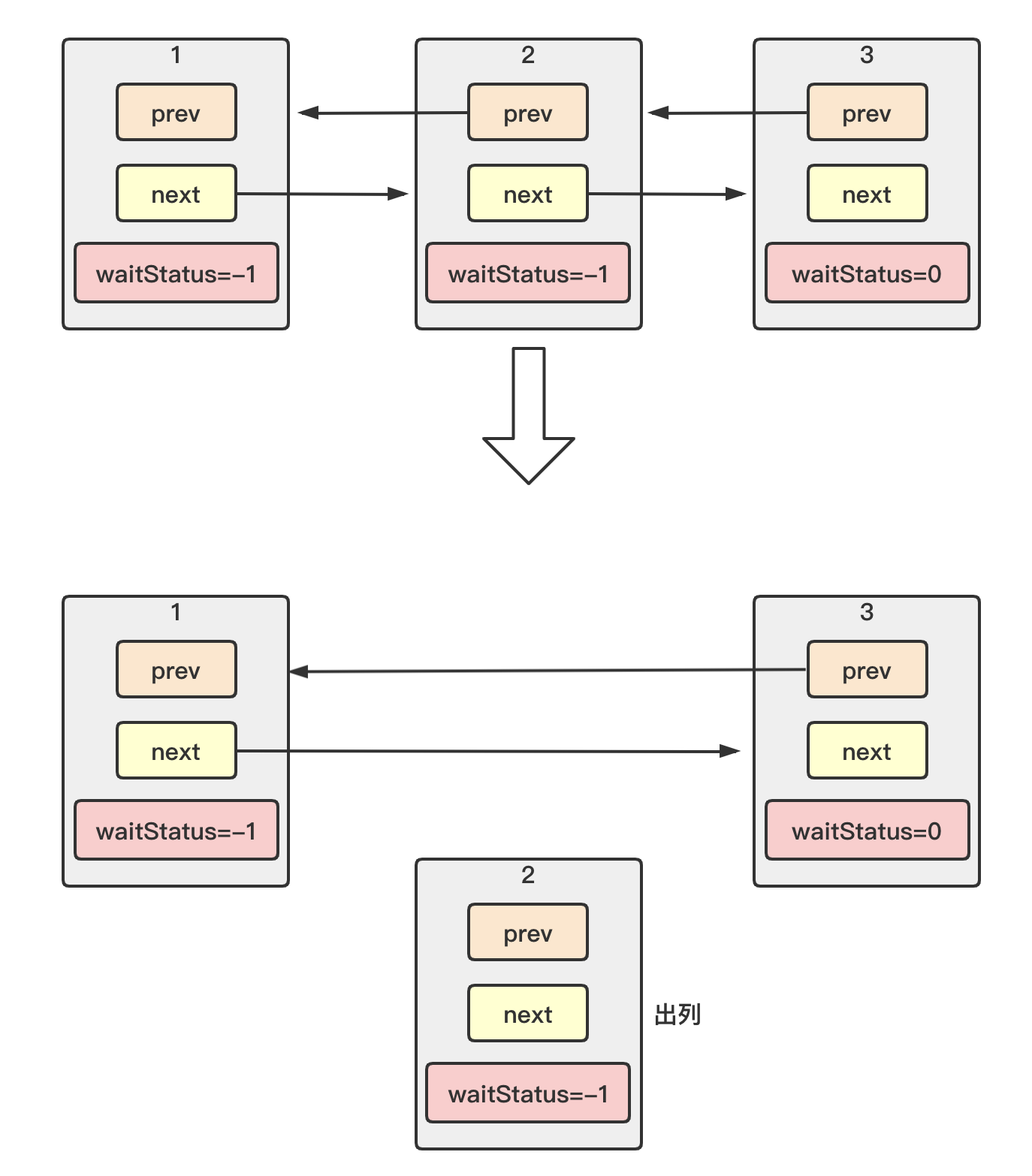 如果CAS修改节点的指向失败了,也没关系,唤醒当前节点的后继节点,让它自己去修改前驱节点的waitStatus,当前节点可以安心出队。