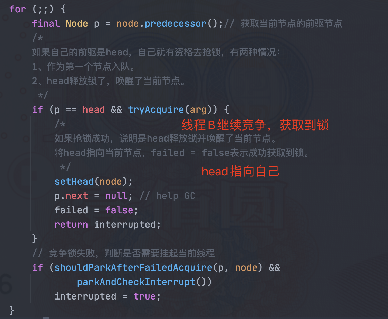 此时线程B会竞争成功,同时会将head指向当前节点。