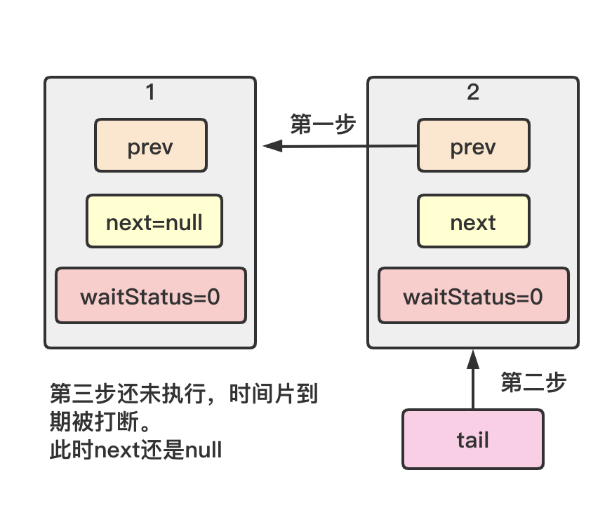 如果执行到步骤2时,时间片到期,此时前驱节点的next还是null,会存在漏唤醒的问题。