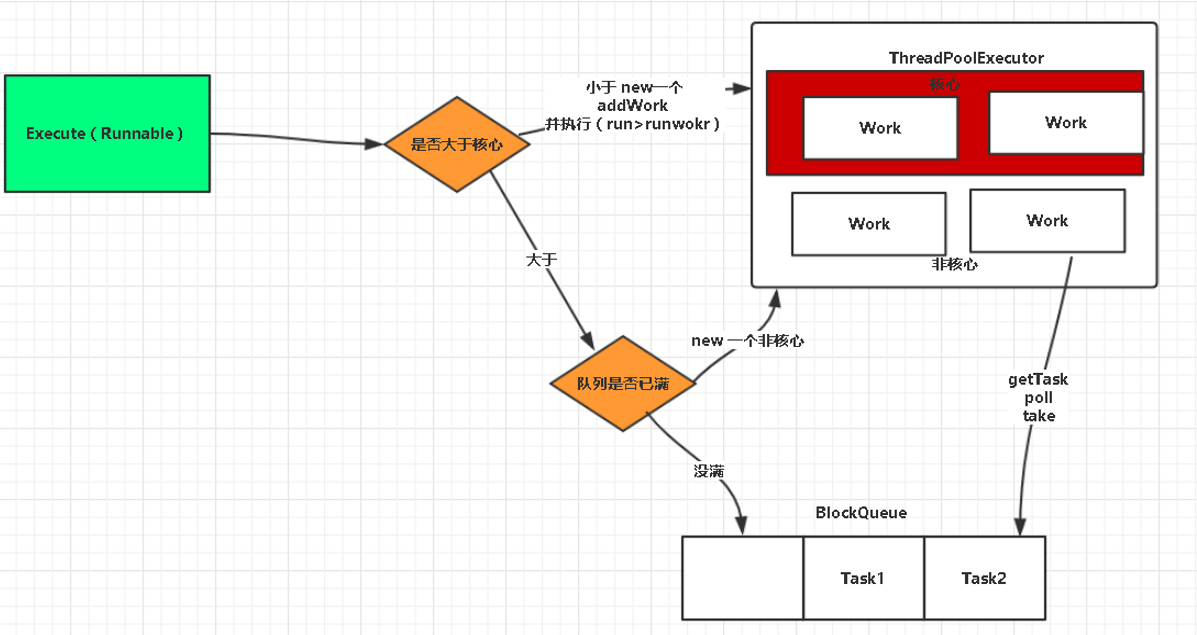 简要分析一下execute源码:执行一个Runnable对象时,首先通过workerCountOf©获取线程池中线程的数量,如果池中的数量小于corePoolSize就调用addWorker添加一个线程来执行这个任务。否则通过workQueue.offer(command)方法入列。如果入列成功还需要在一次判断池中的线程数,因为我们创建线程池时可能要求核心线程数量为0,所以我们必须使用addWorker(null, false)来创建一个临时线程去阻塞队列中获取任务来执行。