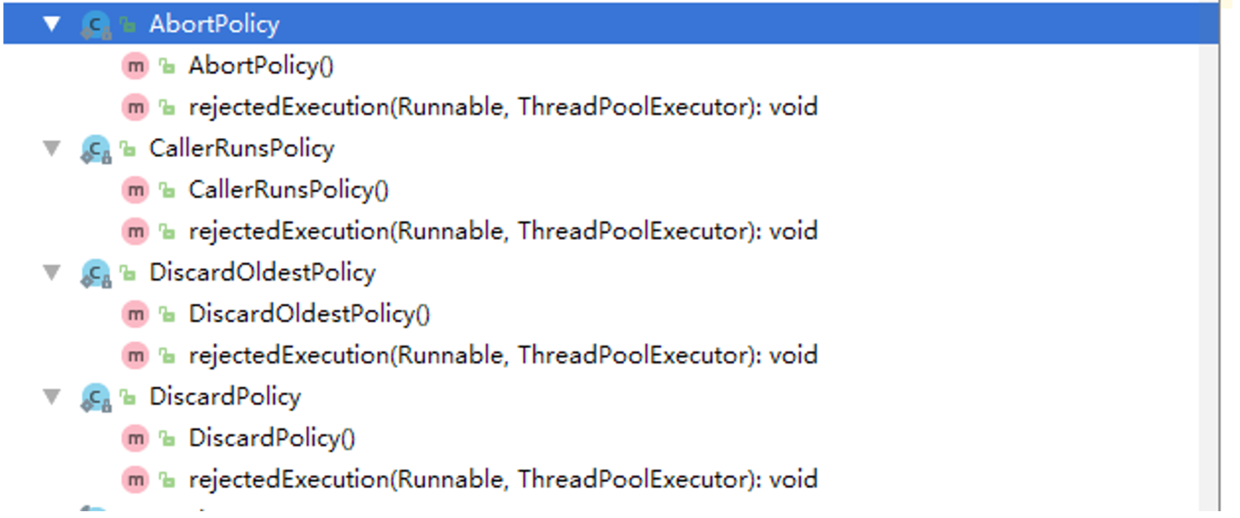 | CallerRunsPolicy | 当任务添加到线程池中被拒绝时,会在线程池当前正在运行的Thread线程池中处理被拒绝的任务。 |