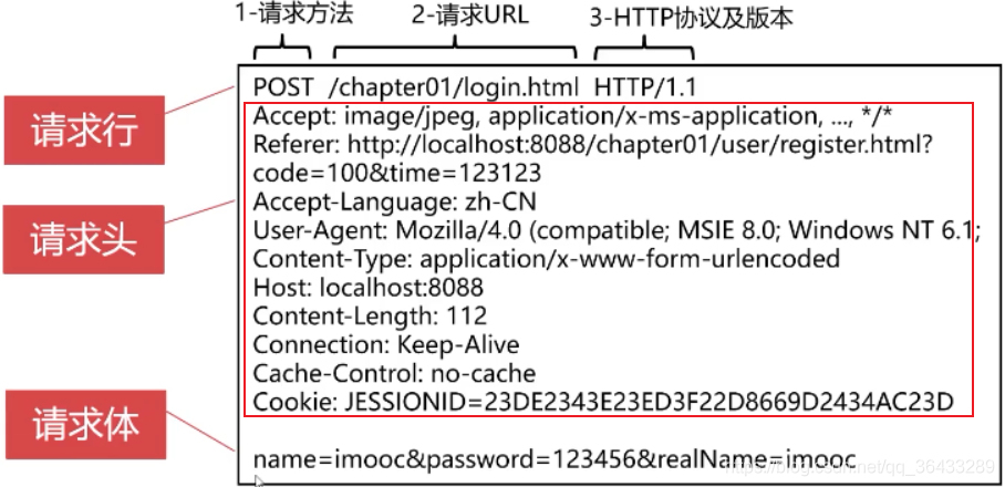 - HTTP请求包含三部分:请求行、请求头、请求体