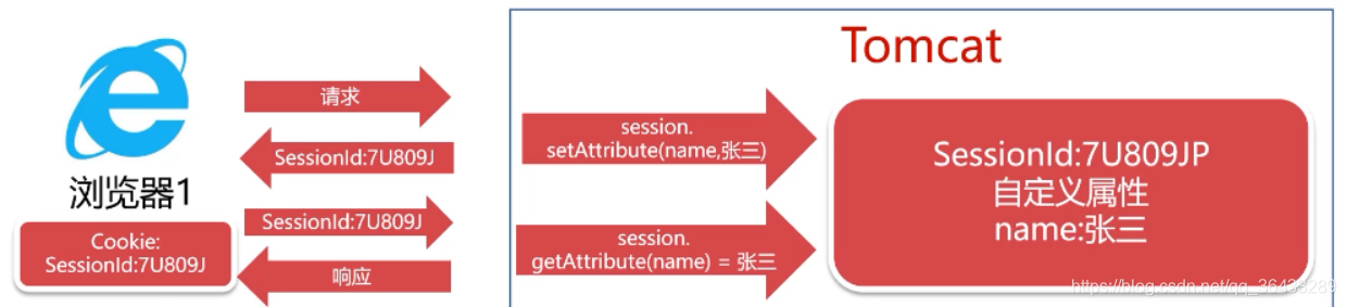 当浏览器第一次向Tomcat发送请求,Tomcat收到请求后,会在运行内存中创建一个全新的存储空间,并赋予一个SessionId;如果我们使用session.setAttribute()方法,会把值存放到内存空间(自定义属性);处理完后响应回传SessionId给浏览器,浏览器会把SessionId保存到Cookie中;第二次请求时,SessionId会发送给Tomcat,Tomcat发现已经存在,调用session.getAttribute()方法会把存储内容直接响应。
