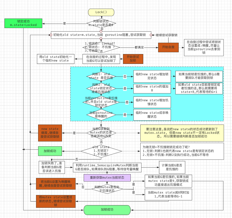 整篇源码其实涉及比较难以理解的就是 Mutex 状态(mutexLocked,mutexWoken,mutexStarving,mutexWaiterShift) 与 Goroutine 之间的状态(starving,awoke)改变, 我们下面将逐一说明。