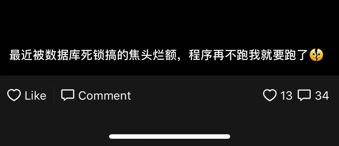 犹记得那些天老板天天找我们几个人开会,大概老板是在传导甲方给过来的压力,人倒霉就是这样,你说 CPU 爆高可怕吧,我硬是给摁下去了,好了,Memory 又爆高了,尼玛我又给摁下去了,接着数据库死锁又来了,你能体会到这种压力吗?🤣 就像我在朋友圈发的那样,程序再不跑我就要跑了。