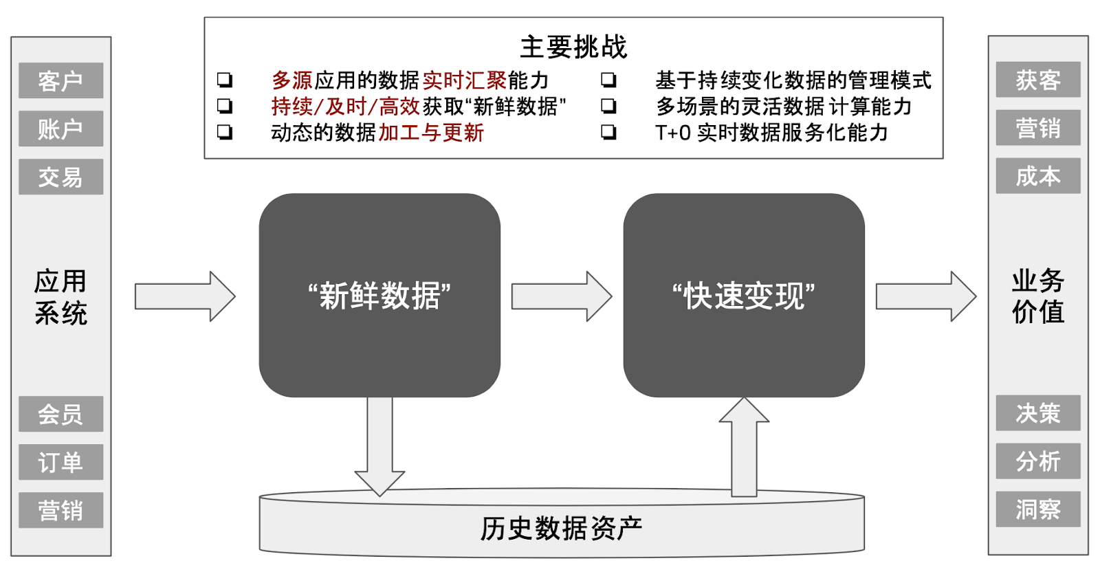在整个数字化转型的过程中,我们认为数据有两个非常核心的要素:第一,各种各样业务发生之际随之而来就产生了新鲜的数据,如何让新鲜数据一直保有实时性的承载价值;第二,当这些新鲜的数据产生之后,如何及时利用新鲜数据完成业务上的快速变现,比如说帮助企业用更低的成本获得更多的客户、如何更高效的推动企业营销活动、如何通过对数据更进一步的实时的观测和分析,来完成业务上的洞察和实时决策等。