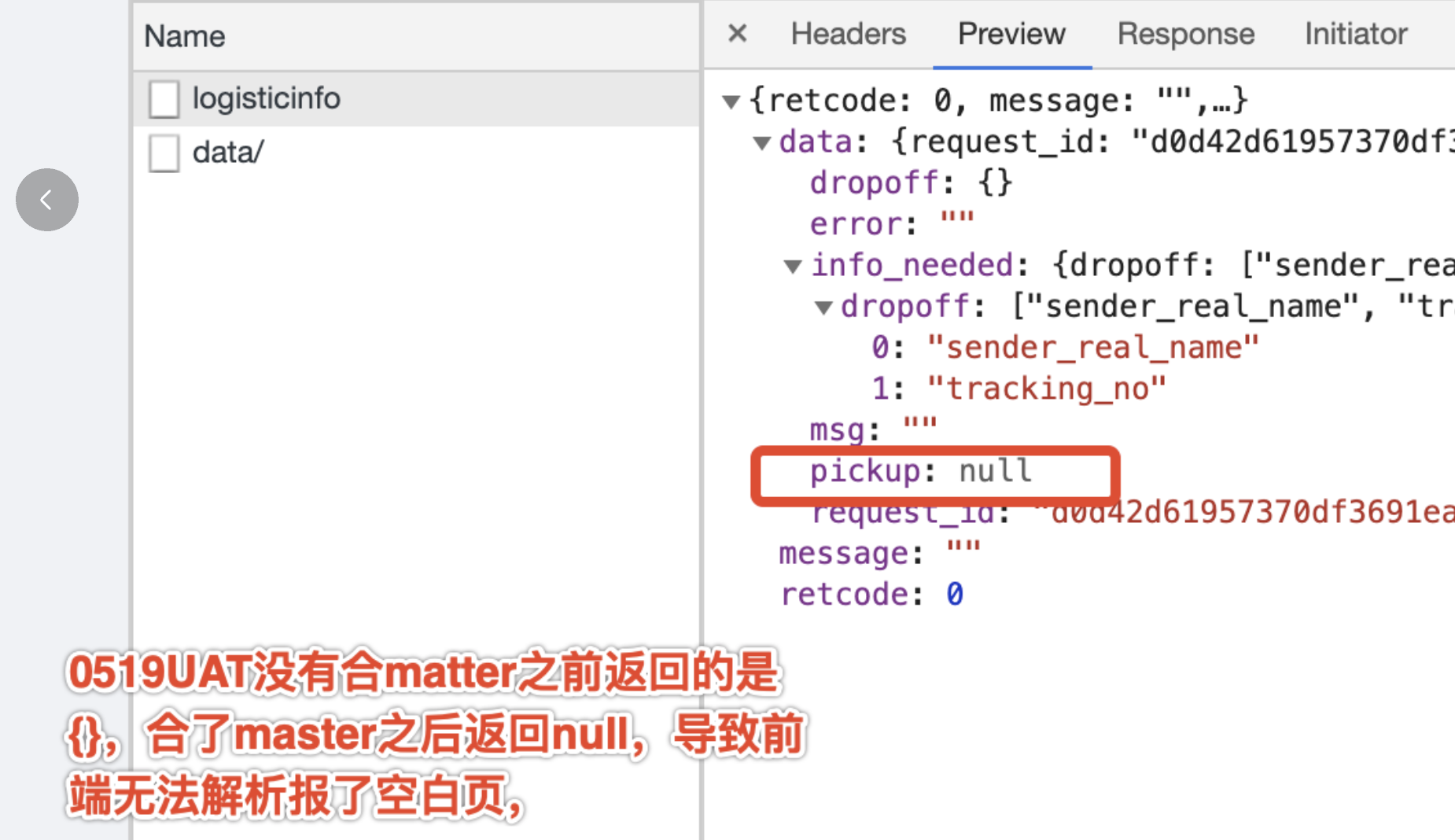 原本 pickup, dropoff 两个字段没有数据的话, 应该返回{}, 结果现在pickup字段返回了null, 而我们取值的时候,也没对这个地方做防御。