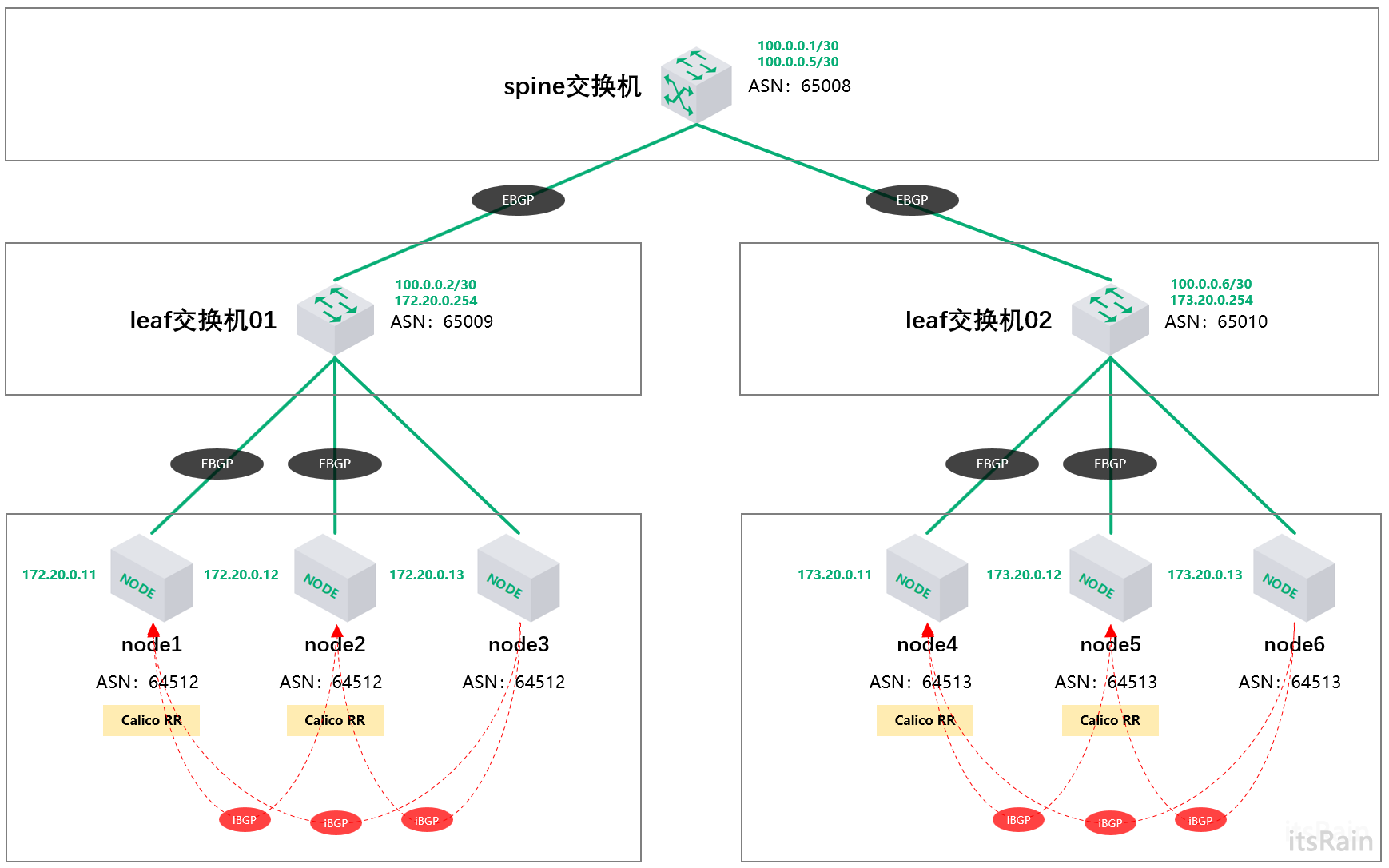 在本次环境中,分别有一台 spine 交换机和两台 leaf 交换机来建立 EBGP 连接。所有 leaf 交换机都属于一个独立的自治系统,所有 leaf 交换机下的 node 都属于一个独立的自治系统。Kubernetes 集群节点中每个 leaf 下由两台工作节点作为 CalicoRR(路由反射器),之所以用两台 node 作为路由反射器是考虑冗余性,所有 Calico RR 都跟自己上联的 leaf 交换机建立 EBGP 连接。Calico RR 和自己所属的 node 之间建立 iBGP 连接。