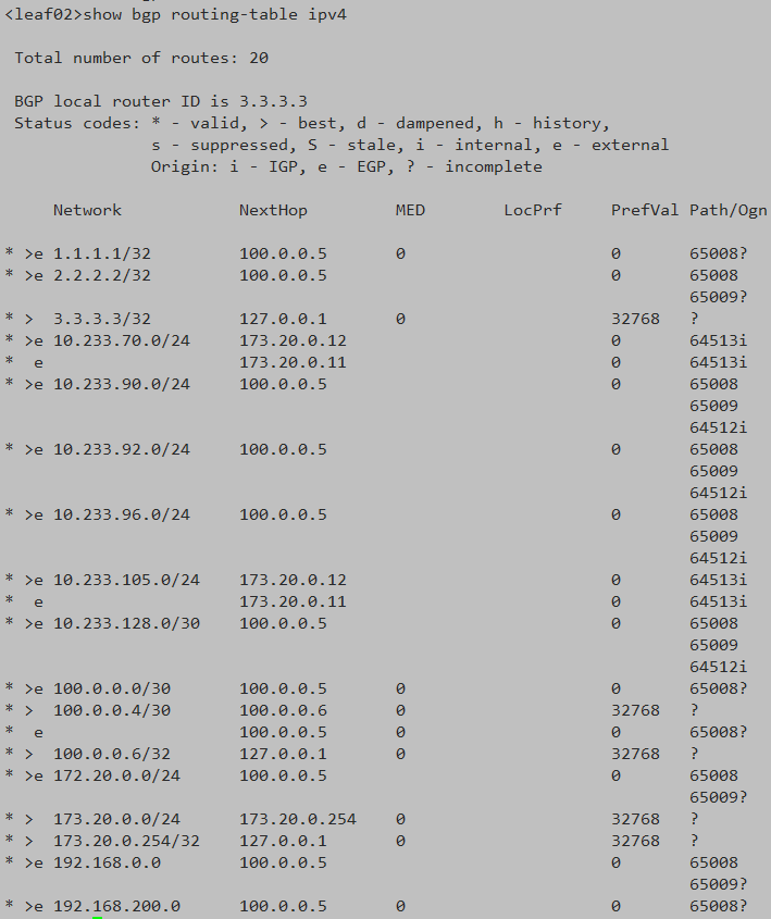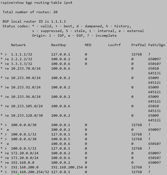 我们可以在所有交换机里去查看 BGP 同步的路由信息有没有署于 pod 的路由地址