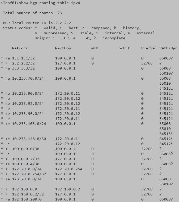 可以看到该节点已经和 node1 和 node2 节点建立了 BGP 连接,因为该节点不作为路由反射器节点,所以并为与 leaf01 交换机建立 bgp 连接。