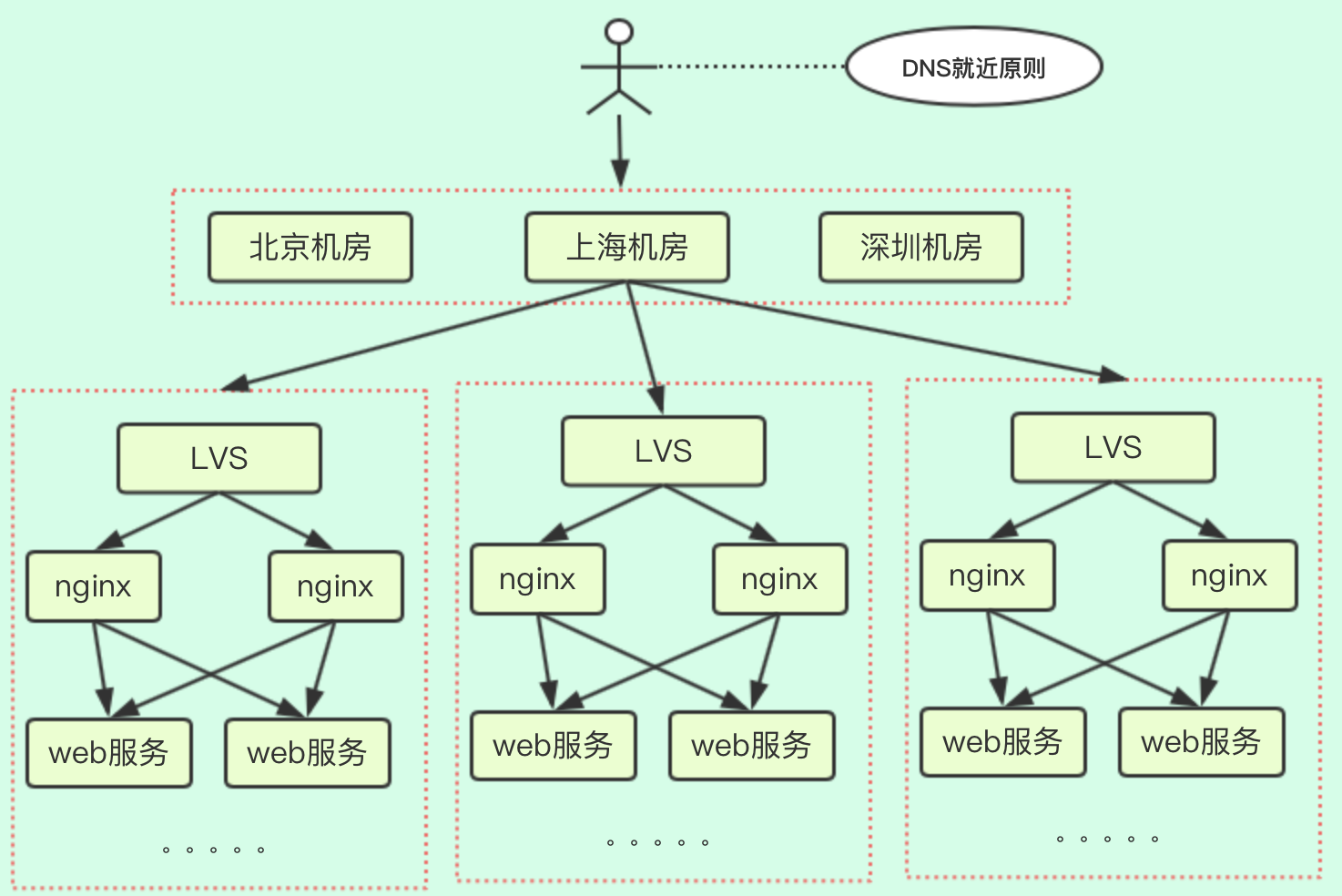 业务时全国市场,甚至全球市场的话,因为地区网络节点是按照地区架设的,所以要保证多地区能够快速访问我们的网站,这个时候就需要做多机房的设计。多机房的设计就是利用了DNS,这个就是DNS层的负载均衡