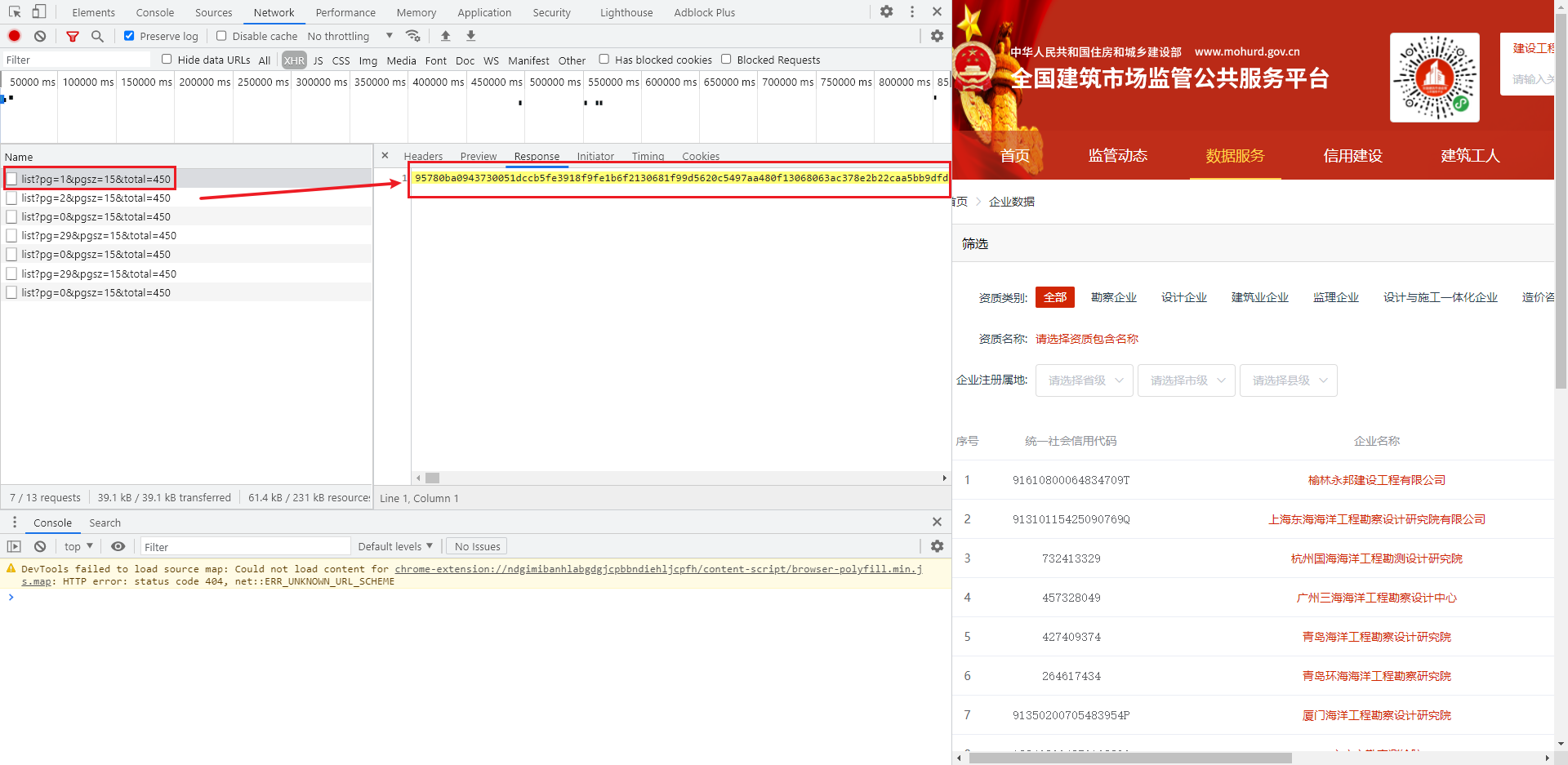 本次的逆向目标是建筑市场监管平台的企业数据,来到全国建筑市场监管公共服务平台首页,依次点击数据服务 —> 企业数据,尝试抓包一下所有企业的数据,可以看到返回的数据是经过加密的: