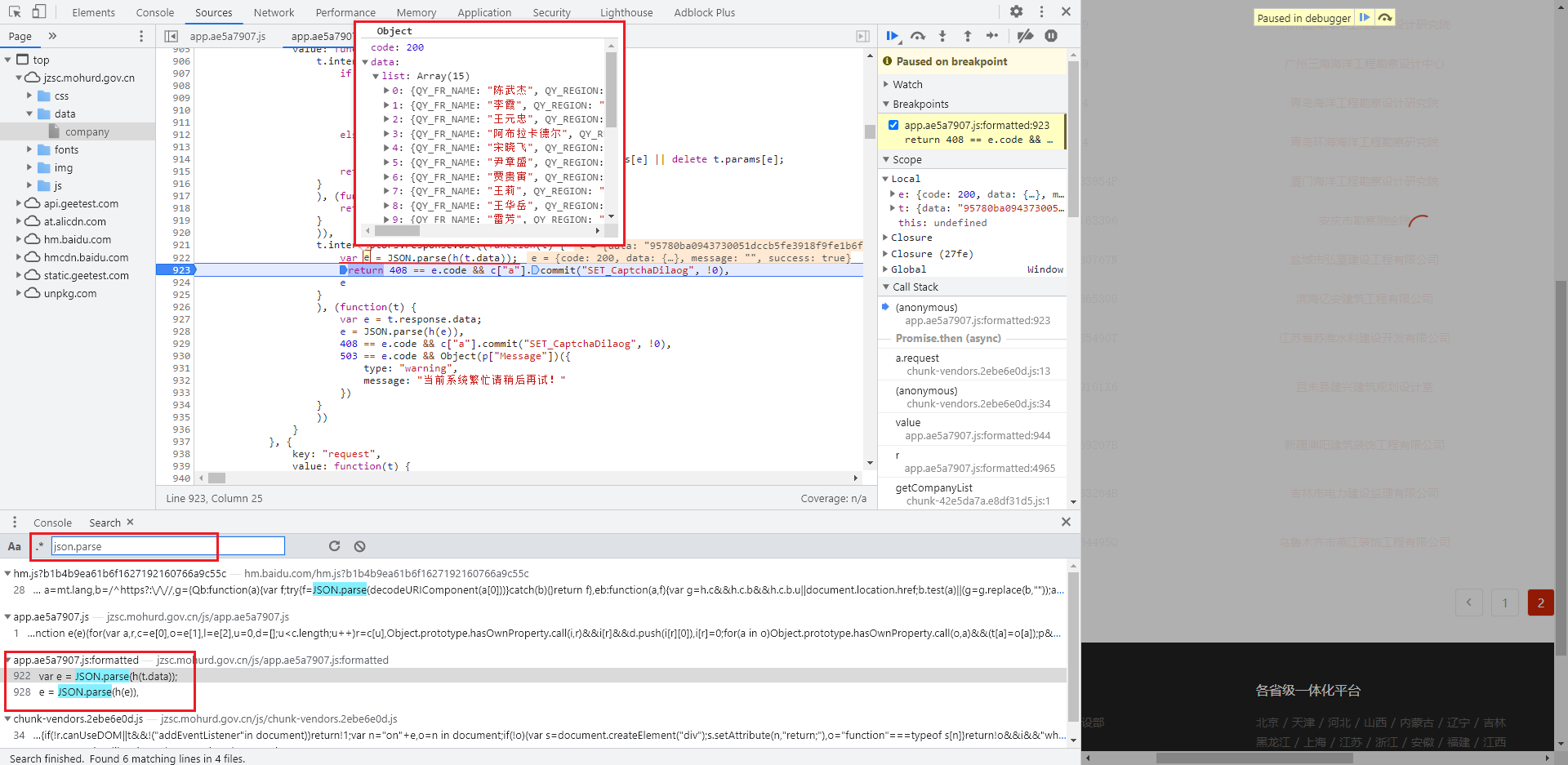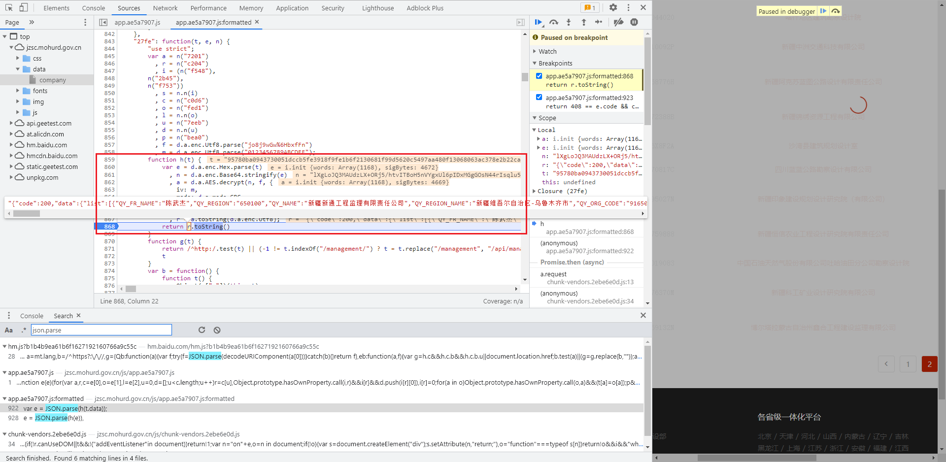 数据看不出来是什么加密方式,但是加密分析得多了,就知道一般都是经过 CryptoJS 加密模块加密得到的,那么我们可以尝试直接搜索 CryptoJS,decrypt 等关键字,或者搜索加密算法中经常用到的偏移量 iv、模式 mode、填充方式 padding 等,还有一般的 JSON 数据可以搜索 JSON.parse 等,这里直接搜索 JSON.parse,在 app.a9f6bb6d.js 文件里定位到可疑代码,埋下断点进行调试: