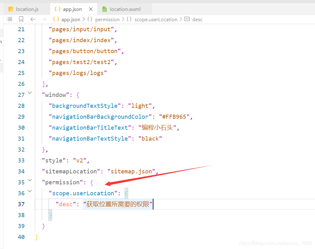这个使用之前必须要在app.json里注册权限,如果不注册权限,就会报如下提示
